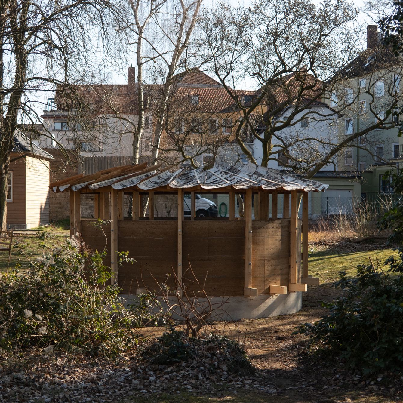 Through a collective building process, a rammed earth body emerged on site – formed in the rhythm of the ramming, layer by layer. The formwork was reconfigured into a light roof structure and seating. The birch bark roof arches in waves above the massive earthen sculpture – a poetic counterweight of lightness and density.